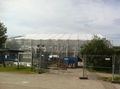 På den nedersta bilden ser man hur Lindgårdens tak nu täcks av plast för att uppbyggnaden ska kunna ske utan att regn tränger in. Betongplattan ska torka och man räknar med att själva bygget av Lindgården kan båbörjas tidigast i januari/februari.
