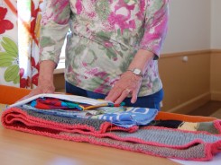 De stickar filtar, sockor, mössor och tröjor och syr fina barnkläder som packas i babypaket. Via Brödet och Fiskarna skickas paketen till flyktingläger i Algeriet och delas ut till mödrar med nyfödda barn. Välkommen du också!Läs mer om packgruppen här på hemsidan.